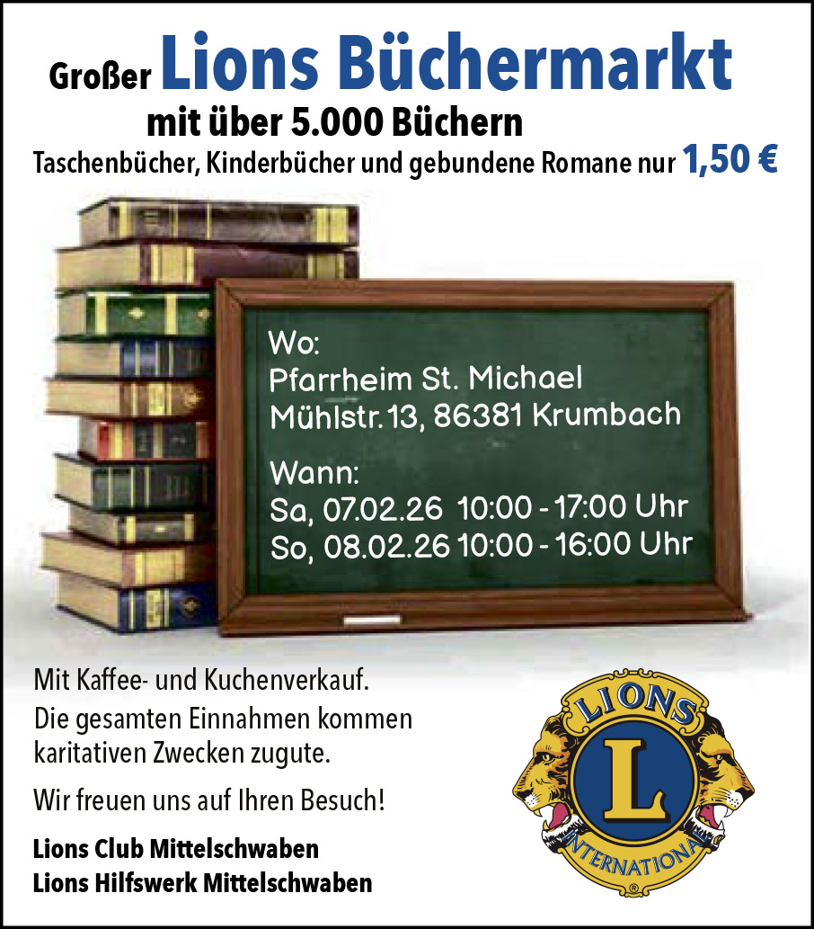 Das erste Februarwochenende wird wieder zur Fundgrube für Leseratten im Pfarrheim St. Michael in Krumbach. Der Lions Club Mittelschwaben veranstaltet wieder seinen Gebrauchtbüchermarkt mit über 5000 Büchern zur Auswahl. Taschenbücher, Kinderbücher und gebundene Romane sowie Bildbände stehen in großer Auswahl für geringen Preis zum Kauf zur Verfügung. Am Samstag 1. Februar 2025 von 10 bis 17:00 Uhr und Sonntag 2. Februar 2025 von 10 bis 16:00 Uhr bietet sich Gelegenheit zum hineinschmökern und bei Kaffee und Kuchen zu verweilen. Der Erlös kommt natürlich wieder sozialen Zwecken zugute.